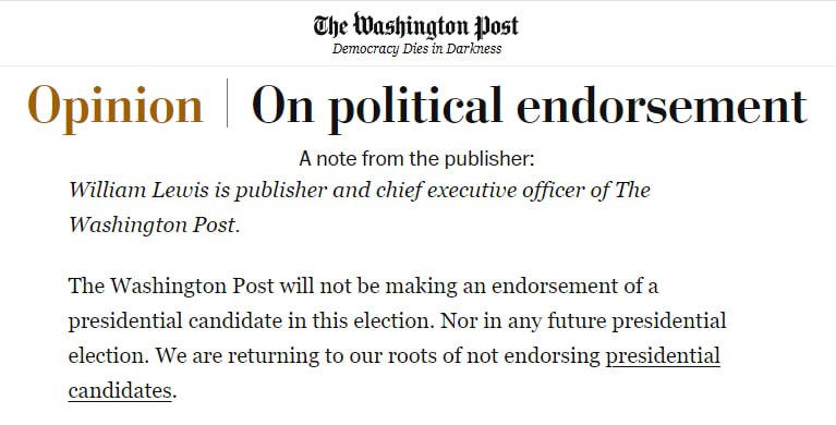 The Washington Post не будет поддерживать кандидатов в президенты США на ближайших выборах и всех последующих