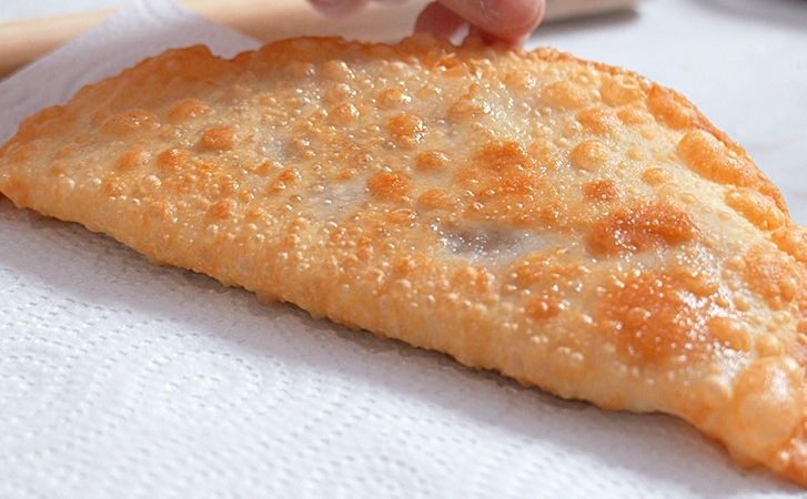 На одну половину выложите 1/10 часть начинки, распределите, накройте второй половиной теста и хорошо прижмите края — сначала руками, затем вилкой. Подготовьте все чебуреки сразу, накрыв их полотенцем, чтобы не заветрились. Разогрейте в глубокой сковороде растительное масло — достаточно, чтобы чебуреки в нём свободно плавали. Масло не должно дымить.