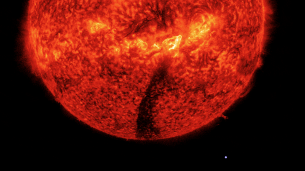 В лаборатории объяснили, что очередная вспышка выбросила большое количество холодного (по сравнению с окружающим веществом) водорода, который около трех часов рассеивался по короне в виде гигантского облака. Для сравнения внизу видео голубая точка — это наша Земля.