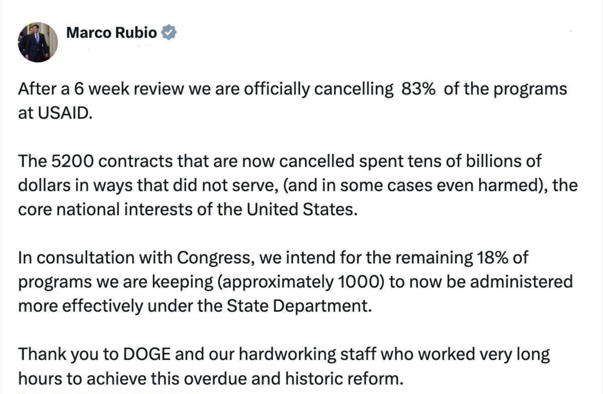 «В ходе расформирования структуры, были полностью прекращены 5200 контрактов, на которые было потрачено десятки миллиардов долларов. По словам Рубио, деньги были потрачены бездарно, а в некоторых случаях, потраченные финансы даже нанесли вред национальным интересам США. Госсекретарь США добавил, что после консультаций с Конгрессом оставшиеся программы должны передать Госдепартаменту для более эффективного администрирования»