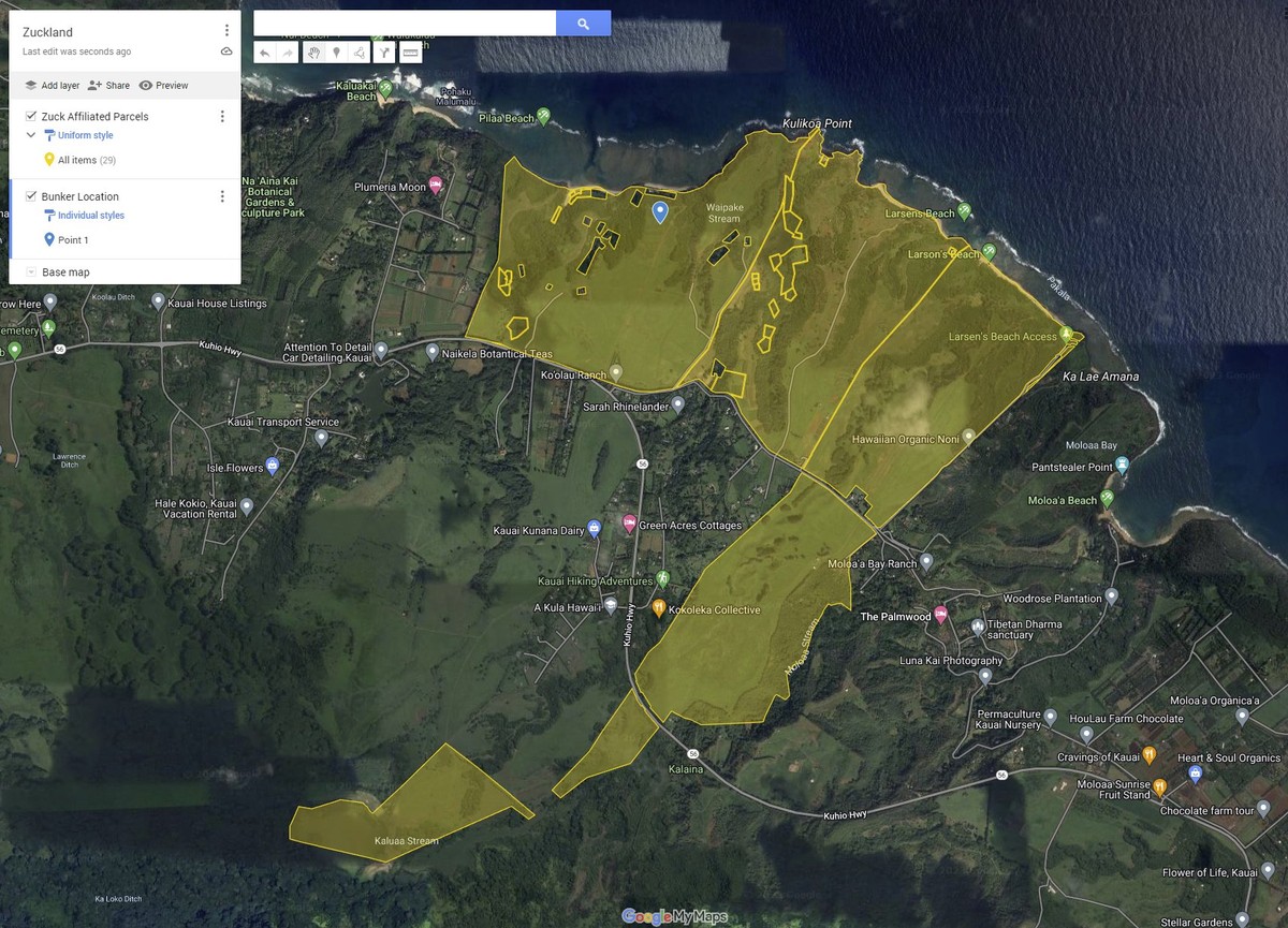 Марк Цукерберг тихо скупил более 9 квадратных километров земли на гавайском острове Кауаи, где строит массивный комплекс. В центре поместья Ko'olau Ranch находится подземное убежище площадью 465 квадратных метров, доступное через туннель, соединяющий два больших особняка. Бункер оборудован взрывостойкими дверями, секретным аварийным выходом и функциями "комнаты паники".