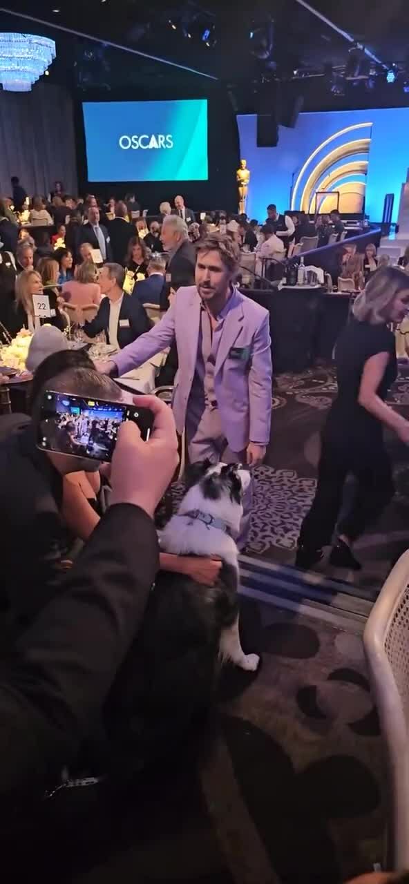 Пройдя инструктаж и оторвавшись от салатов ради «классного фото», номинанты принялись общаться. Однако Райану Гослингу было вовсе не до соседей по столу. Внимание актера привлек самый очаровательный коллега и звезда вечера — пес Месси, блистательно сыгравший в «Анатомии падения» и даже удостоенный за это каннской собачьей награды. Он так впечатлился пушистым четвероногим красавцем, что даже не понимал, как себя вести: то ли подойти и погладить, то ли восхищаться в сторонке. Этот забавный момент засняли на видео и тут же запостили в Сеть. И лично мы пересмотрели его уже несколько раз!