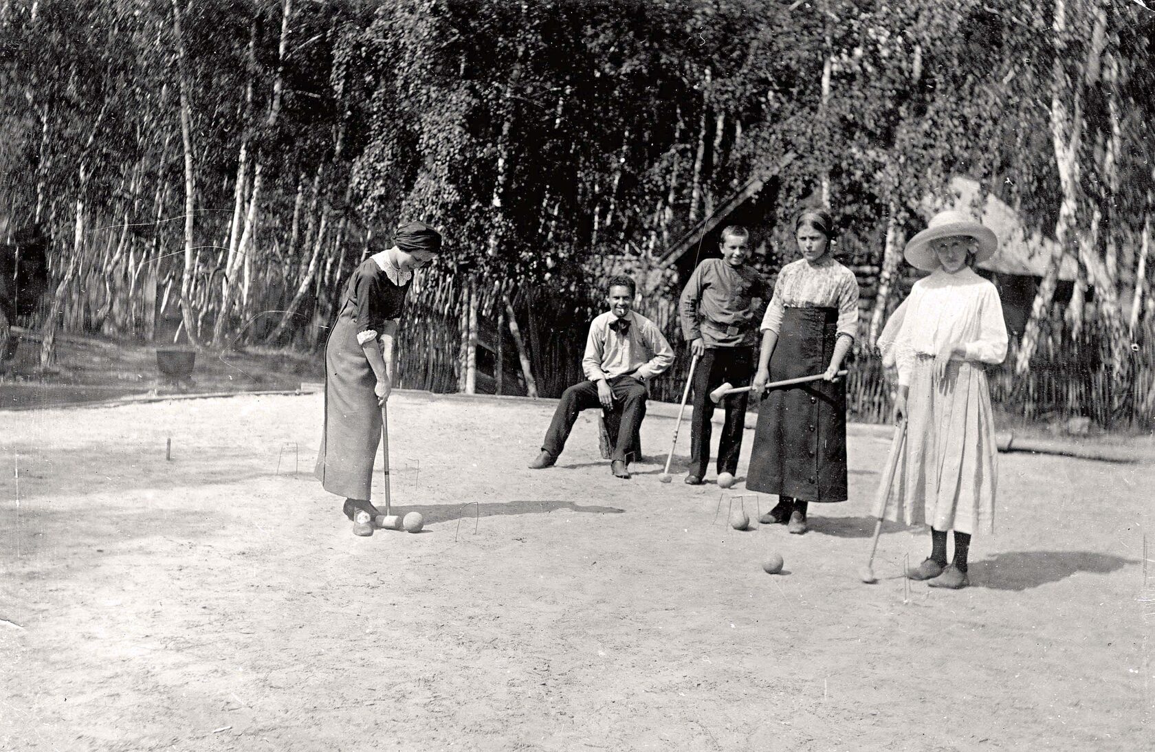 Перед нами — мама большого шумного семейства, снимающего на лето дачу где-нибудь в Красном Селе или Вырице. И молоток для игры в крокет у нее в руках не просто так: это демократичное развлечение пользовалось особой популярностью у отдыхающих. Инвентарь для него был простым и недорогим, а занять можно было всех — и маленьких, и взрослых.