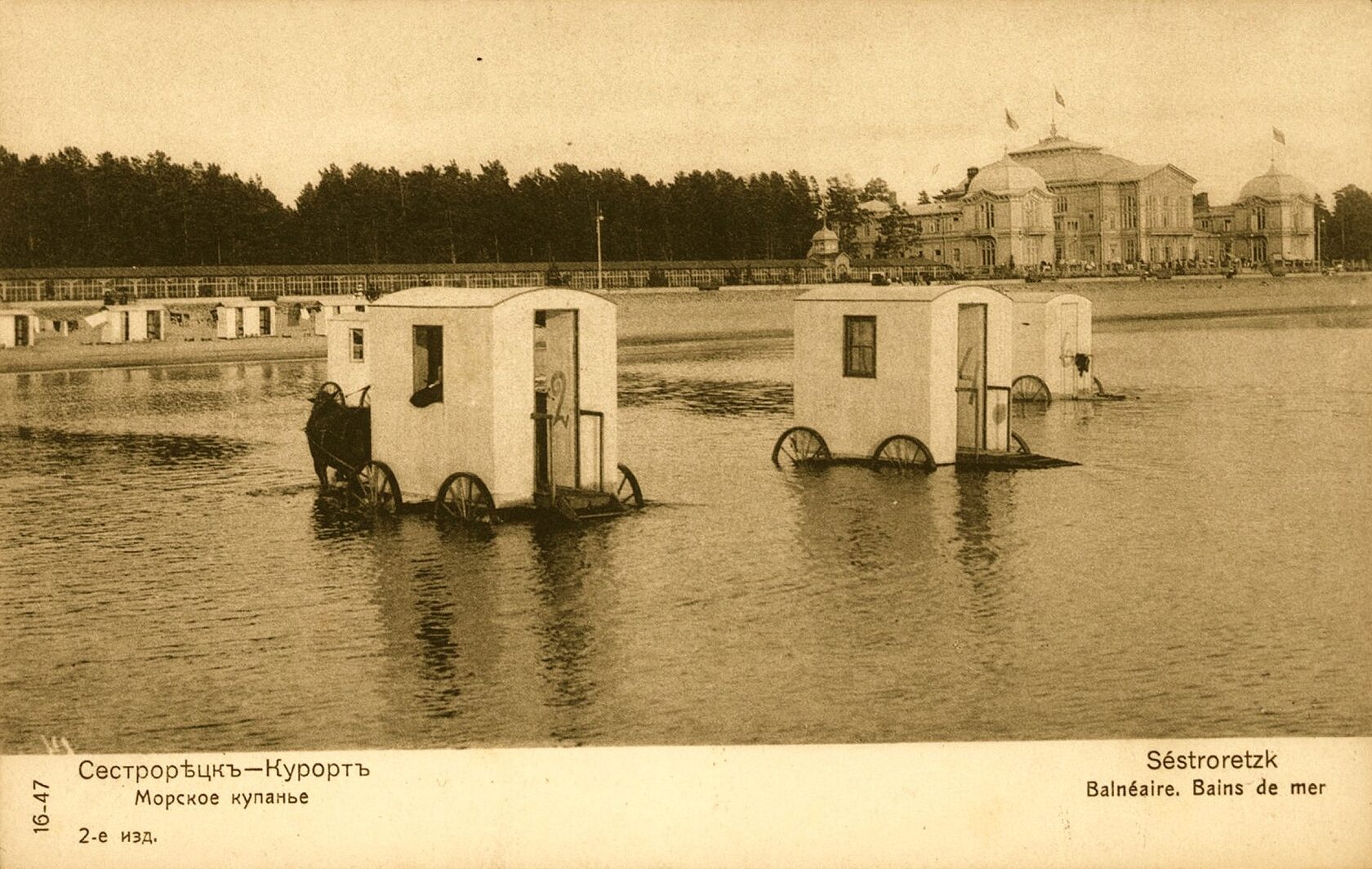 В начале прошлого века ее можно было встретить, к примеру, на одном из пляжей Сестрорецка. Чтобы искупаться, молодая петербурженка устраивала целую церемонию. Сначала — уезжала на глубину в запряженной лошадью кабинке, потом — переодевалась, по сути, в небольшое платье и плавала с соблюдением всех приличий.
