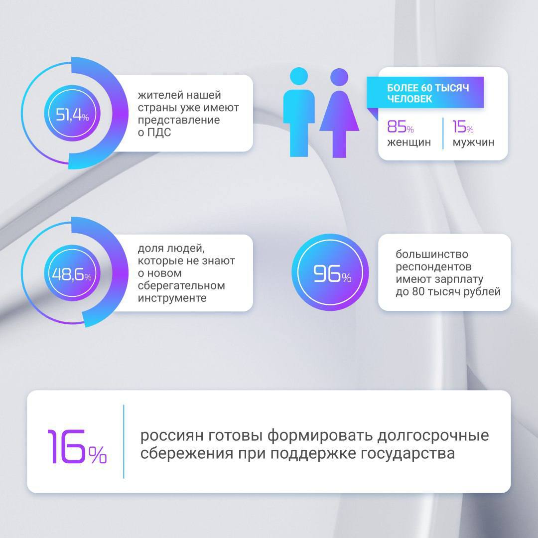 По данным НАПФ, 51,4% жителей нашей страны уже имеют представление о ПДС. В опросе, который проводился по заказу Ассоциации, приняли участие более 60 000 человек – 85% женщин и 15% мужчин. Большинство респондентов – 96% указали, что имеют зарплату до 80 тысяч рублей.