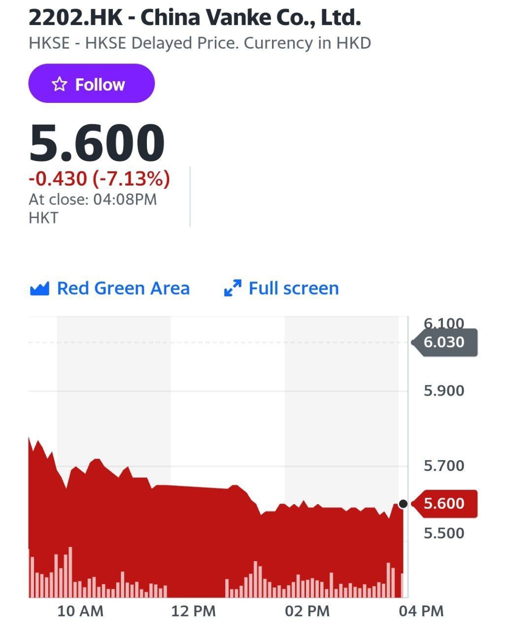 Акции Vanke подешевели на 7,13% на торгах в Гонконге, до 5,6 гонконгского доллара ($0,72): это самый низкий уровень за всю историю.
