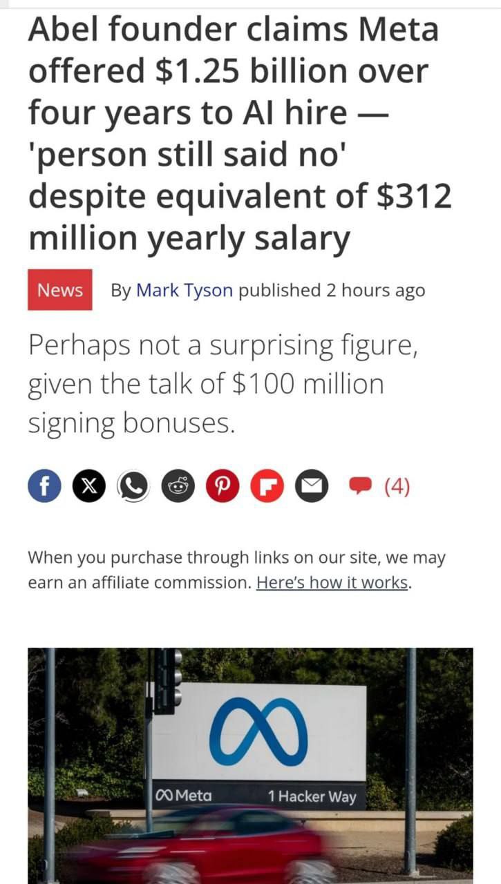Марк Цукерберг предложил рекордную зарплату — $1,25 млрд (около 100 млрд руб) за 4 года специалисту по ИИ, но тот отказался. На данный момент это самое крупное предложение в гонке ИИ.