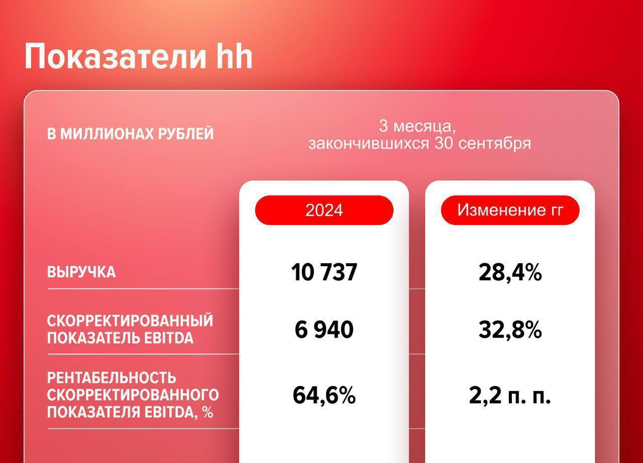 По итогам прошедшего квартала HeadHunter нарастил чистую прибыль на 28% г/г (10,7 млрд руб.), скорректированна чистая прибыль выросла на 84% г/г (7,25 млрд руб.). При этом выручка компаний HR-tech сегмента, входящих в контур hh group, с начала года составила 1,3 млрд руб., увеличившись более чем на 52% в годовом выражении. @banksta