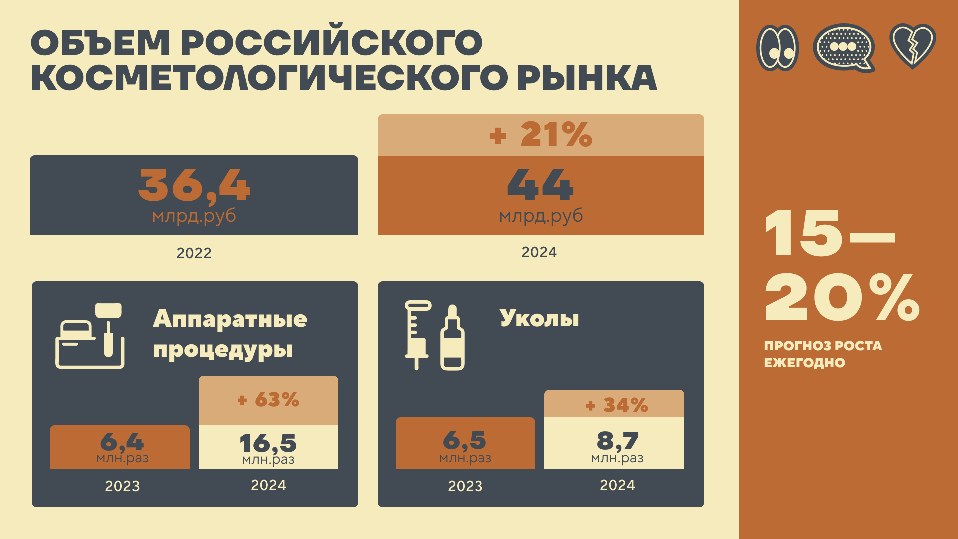 В последние годы объем косметологического рынка в России постоянно увеличивался. По оценке аналитической компании «Право на здоровье», общий объем российского косметологического рынка инъекций и препаратов в 2024 году составил 44 млрд руб. (на 21% больше по сравнению с позапрошлым годом). В ближайшие годы прогнозируется его рост на 15–20% ежегодно. Главным драйвером здесь являются аппаратные процедуры: в прошлом году их сделали 16,5 млн раз, что на 63% больше, чем годом ранее. Также популярны инъекции: уколы, в том числе ботулотоксина, коллагена и филлеров, сделали 8,7 млн раз, эта ниша выросла за год на 34%.