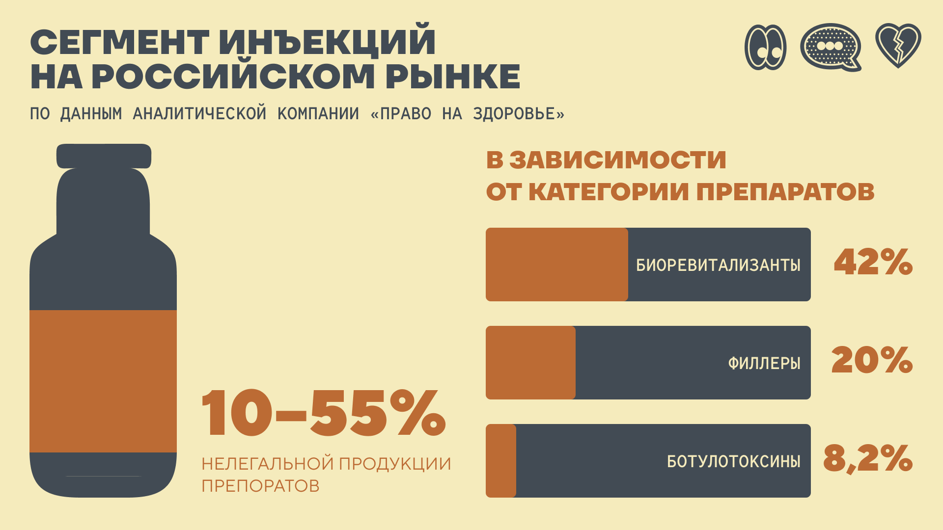 Происхождение препаратов может вызывать вопросы. По данным аналитической компании «Право на здоровье», в сегменте инъекций — от 10% до 55% нелегальной продукции в зависимости от категории препаратов. Так, среди биоревитализантов количество нелегальных продуктов — 42%, в группе филлеров — около 20%. Доля ботулотоксинов на сером рынке — 8,2%. Их часто продают через специализированные форумы. Еще более пугающий тренд: появление на маркетплейсах филлеров для введения дома.