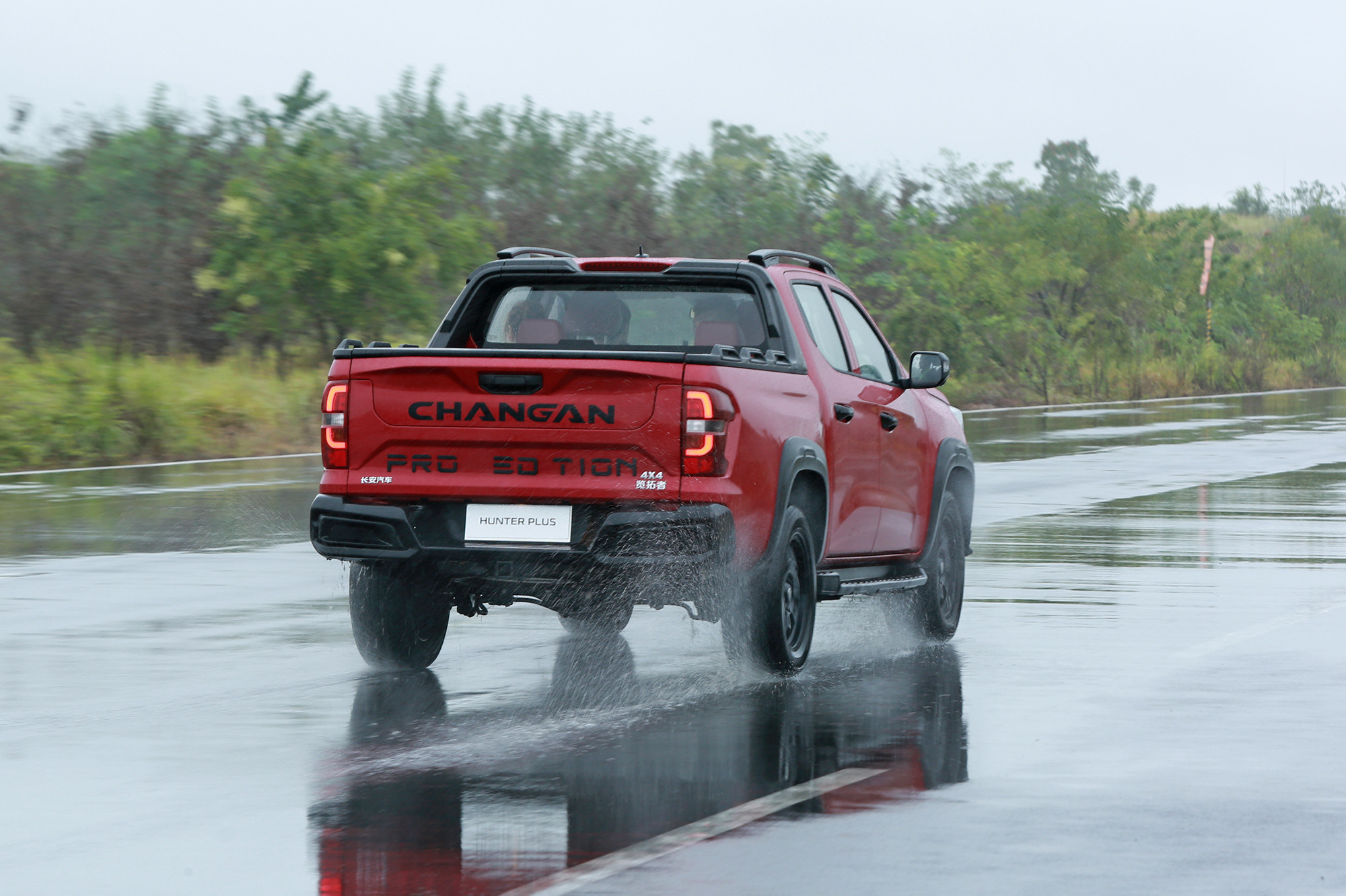 В поворотах (не очень нормальных) на мокром асфальте пикап ожидаемо кренится и уходит в скольжение. Упрекать его в этом не буду: снаряженная масса у него 2060 кг, так что ему это позволительно. Да и непонятно, что представляют собой шины, в которые его обули на заводе. В целом его поведение прогнозируемое и для немаленького (5350х1980х1875 мм) пикапа вполне приемлемое. К сожалению, у нас не было возможности испытать машину на бездорожье, но на полигоне с искусственными колдобинами (неожиданно серьёзными, будто по нашему ГОСТу на колдобины сделанными), брусчаткой и имитацией других неровностей Hunter Plus пролетал без особых сложностей. И даже на искусственных ямах, когда я был готов услышать хруст шейных позвонков, пикап вёл себя молодцом.