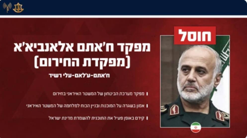 Израиль заявил о ликвидации командующего ВКС КСИР в ходе ударов по подземному командному центру. Reuters сообщает, что в ходе атаки по центру были убиты не менее 20 высокопоставленных иранских командиров.