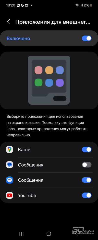Основная фишка Flip6 (как и любого другого «флипа»), помимо самой по себе складывающейся конструкции, – функциональный внешний экранчик диагональю чуть менее двух дюймов. Запускать любые приложения, как на последних Moto Razr, на нем, к сожалению, нельзя. Зато есть специальные заставки с основной информацией (погода, дата, время, уровень зарядки) и карточки, которые можно перелистывать (календарь, погода, будильник, здоровье, контакты, секундомер, таймер, диктофон, звуковые профили). Также можно просматривать уведомления, но не отвечать на них – к примеру, открыть почту или мессенджер не выйдет. Помимо упомянутых выше функций, вы можете вынести на внешний экран приложения – при помощи специальной вкладки в разделе Labs (подразумевается, что это экспериментальная функция). Но их состав каким был четыре года назад, таким и остался: YouTube, «Google Карты» и пара приложений для сообщений (гугловское и фирменное Samsung). Бесшовное переключение между экранами, как на «крупных» складных смартфонах, не поддерживается: начали смотреть видео на разложенном смартфоне – закрываете и запускаете уже заново, ища приложение среди карточек. Можно вывести на внешний экран окошко камеры и использовать тыльную камеру для селфи или видеозвонков в различном формате – или показывать модели при портретной съемке ее саму для лучшего контроля позы.