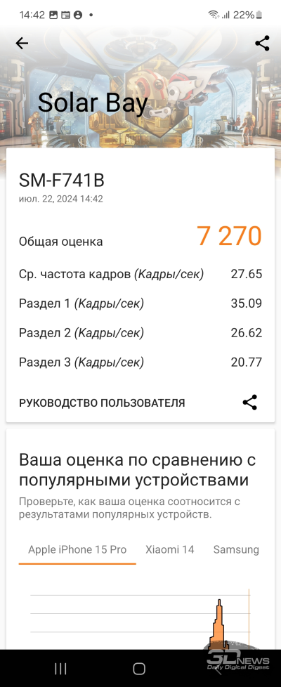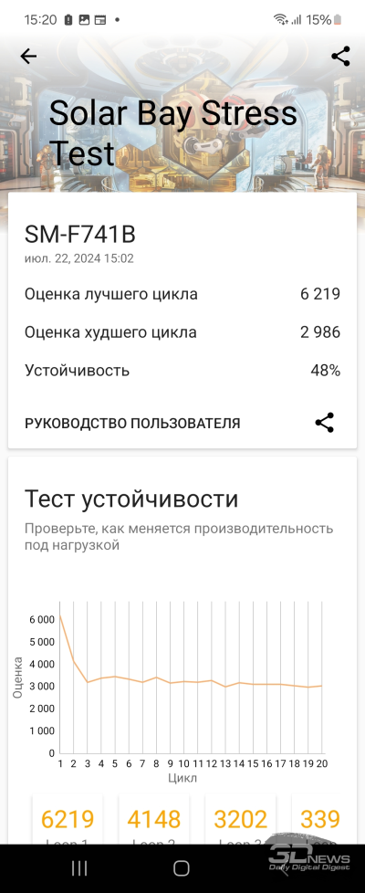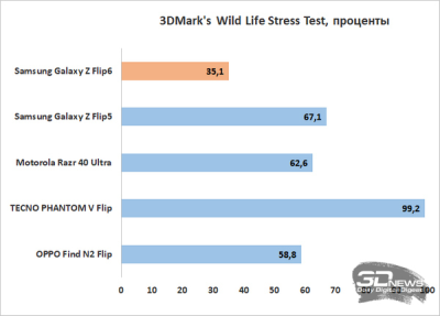 Троттлинг, равно как и повышенный нагрев (на 5-8 градусов за время ресурсного тестирования) у Flip6 очень выражены – от пиковой частоты под нагрузкой «съедается» до 70%. Это, конечно, не чистый перегрев, как и текущих флагманов Xiaomi, но и радости особенной от таких результатов нет. Как игровой смартфон раскладушку Samsung можно рассматривать – запас мощности в любом случае большой, – но с определенными оговорками.