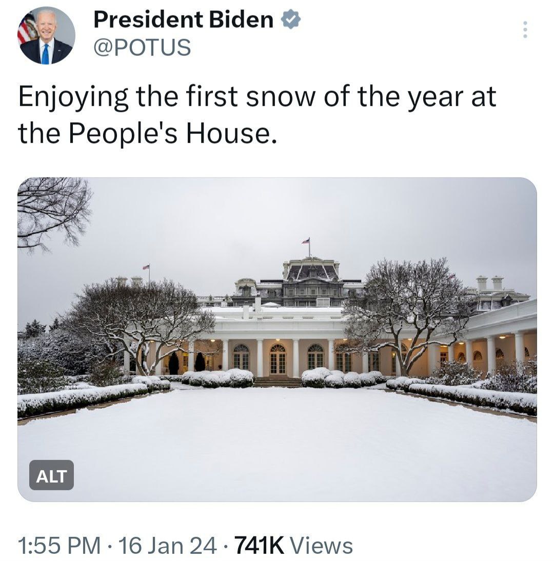 Президент США Джо Байден переименовал Белый Дом в Вашингтоне и сообщил о первом снеге в американской столице в наступившем 2024 году.