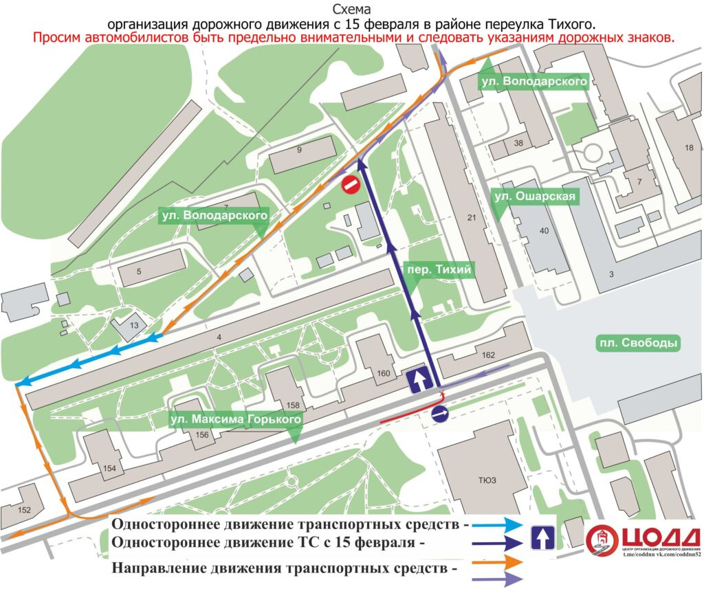 По данным ЦОДД, с четверга по Тихому переулку можно ехать только в направлении улицы Володарского. Кроме того, запретили левый поворот с улицы Максима Горького — на дороге появился знак «Движение прямо». Со стороны Ошарской автомобилисты могут проехать по улице Володарского около дома