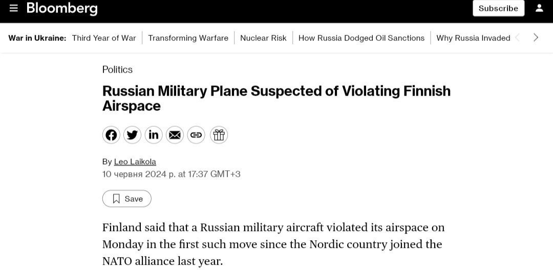 ⚫️ Самолет якобы находился над страной в течение двух минут в понедельник утром и углубился на 2,5 км в территорию Финляндии, пишет Bloomberg со ссылкой на финское Минобороны.
