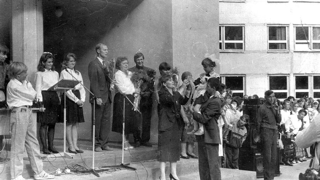 На следующих кадрах — уже 1970-е годы, школы № 3 и 4. На них запечатлены первоклассники, которые участвуют в торжественной линейке. Все с цветами, строго одеты. Вместо рюкзаков у каждого — портфель, даже у классного руководителя.