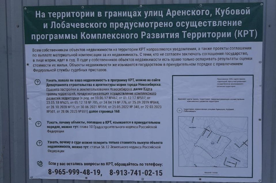 «Стрижи»В компании «Стрижи», которая активно застраивала микрорайон, НГС прокомментировали, что заинтересованы в территории в границах улиц Аренского, Кубовой и Лобачевского. Если рано или поздно будет проводиться аукцион по определению ее застройщика, то компания планирует в нем участвовать. Компания Стрижи» повесила для жителей информационный баннер, что на участке предусмотрена реализация программы КРТ. На нем написано, что собственникам недвижимости в зоне комплексного развития отправляются уведомления и проекты соглашения о выплате маткомпенсации. С теми, кто не согласен его заключать, мэрия будет судиться.