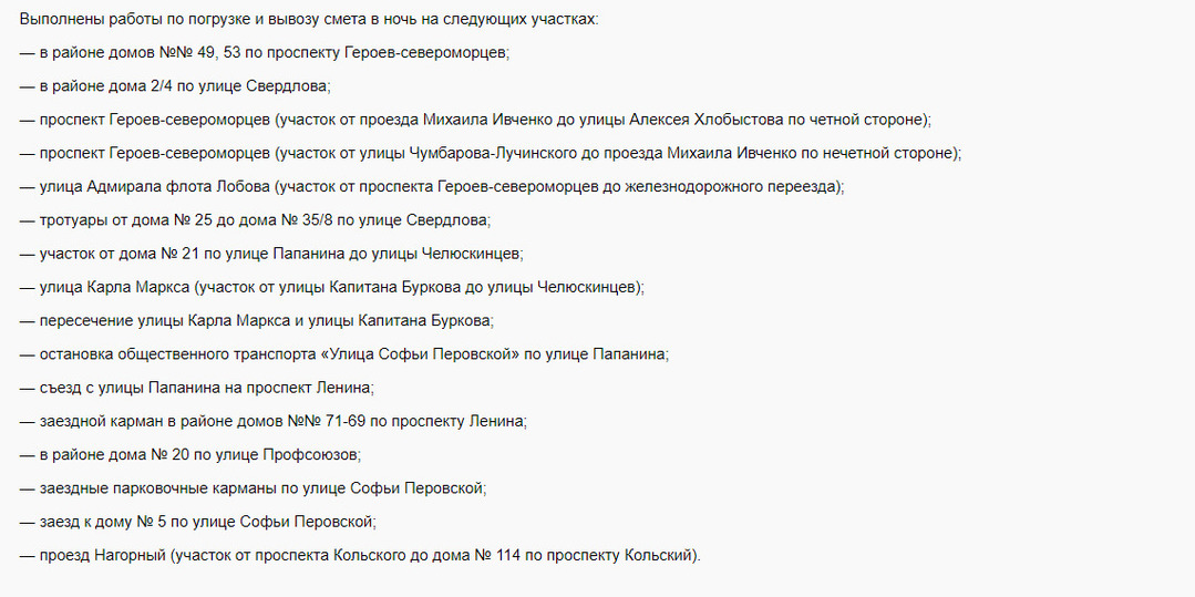 Кроме того, проводились работы по погрузке и вывозу смета в ночь на ряде территорий. Список представлен на кадре ниже.
