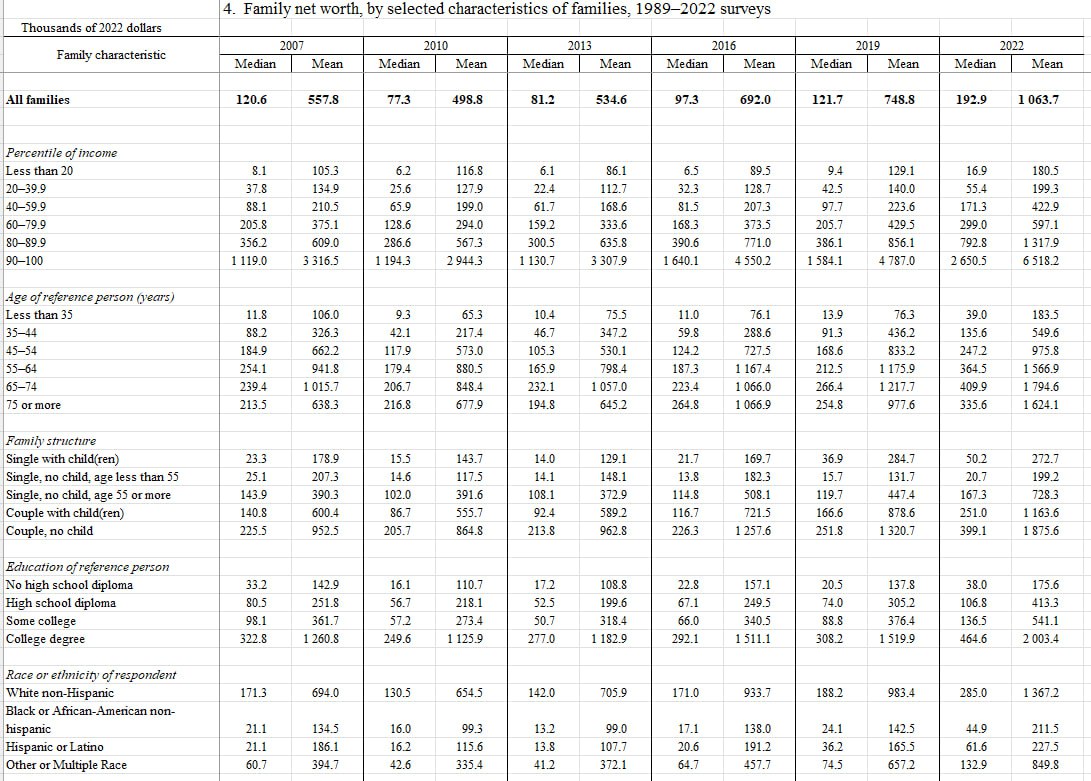 Для всех семей – медиана $193 тыс при среднем значении $1.1 млн в расчете на семью. Считается, что среднестатистическая американская семья имеет чистое богатство почти на 200 тыс долларов.