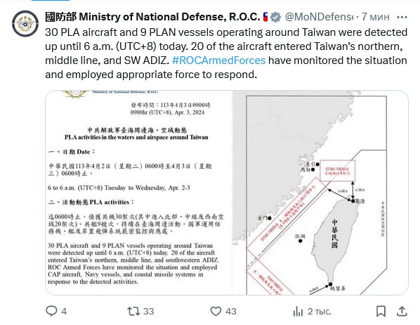 ⚡️Тем временем Министерство национальной обороны Тайваня (Китайской Республики в их трактовке) в Twitter/X заявляет: