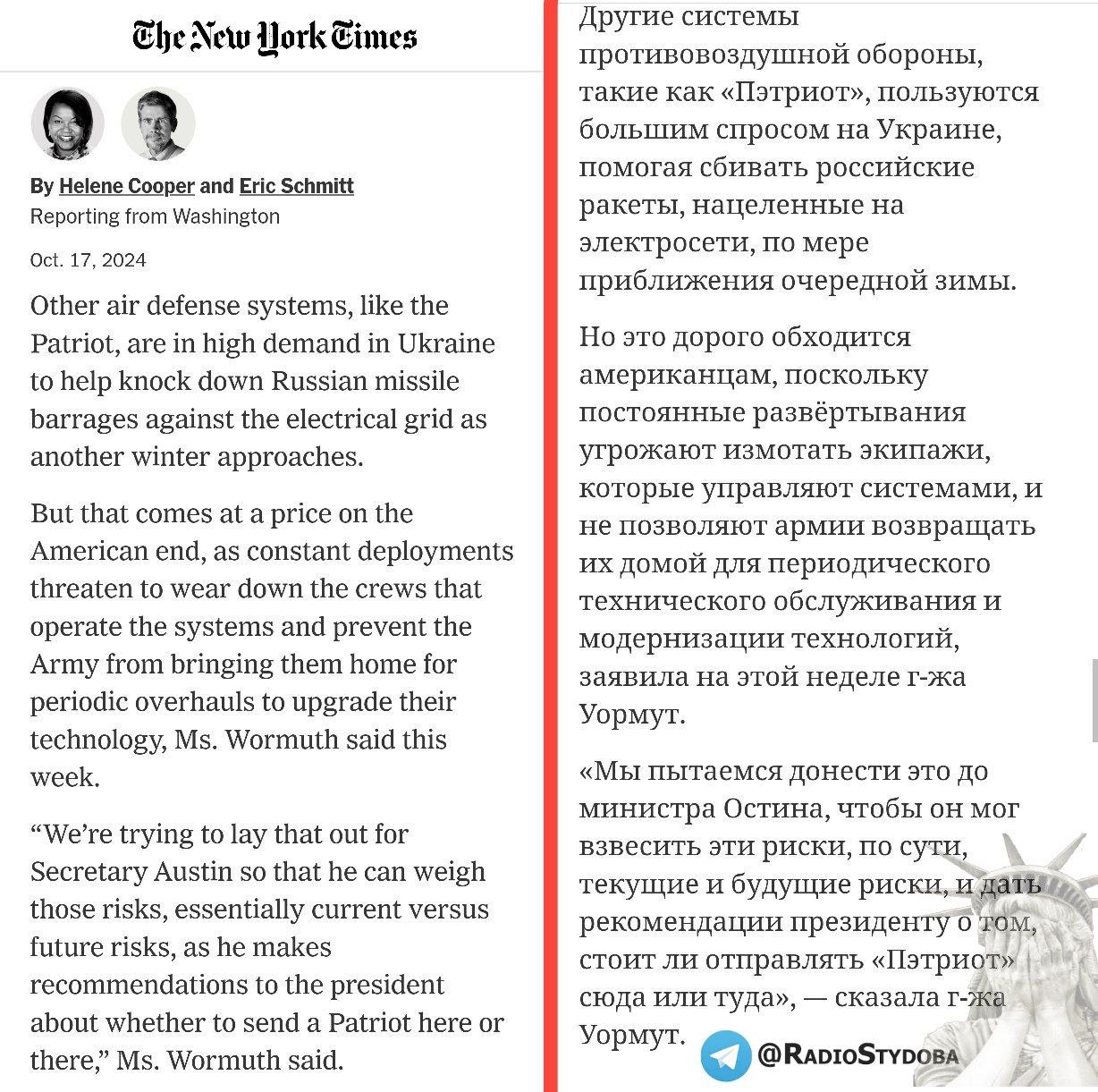 "...Системы ПВО, такие как «Пэтриот», пользуются большим спросом на Украине, помогая сбивать российские ракеты... Но это дорого обходится американцам, поскольку постоянные развёртывания угрожают измотать экипажи, которые управляют системами, и не позволяют армии возвращать их домой для периодического технического обслуживания и модернизации технологий, заявила министр армии США Кристин Уормут.