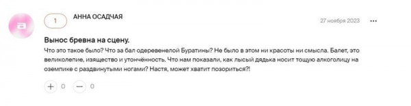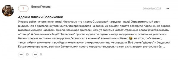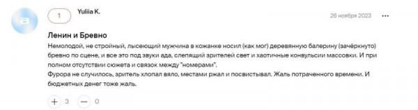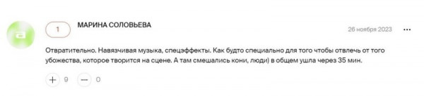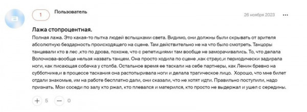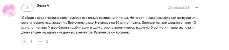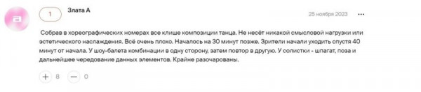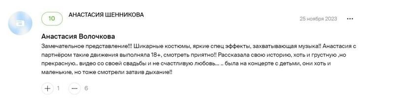 Как ни странно, но среди отзывов затесался один положительный. От некой Анастасии, которая осталась в восторге от шоу. Она даже привела на это действо своих детей.