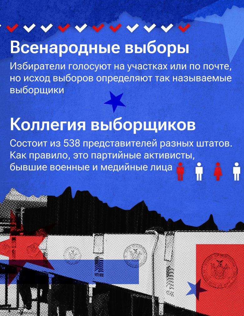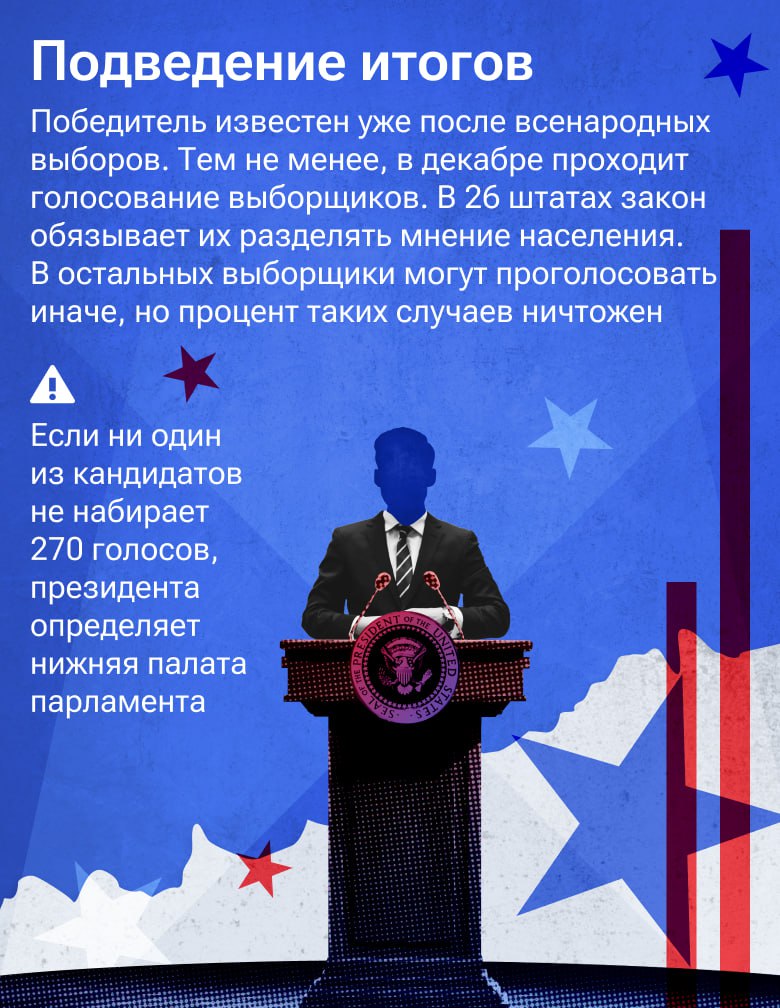 Судя по опросам, поддержка избирателей распределяется примерно поровну. Исход голосования решат колеблющиеся штаты, где жители не отдают явных предпочтений ни одному из кандидатов. В этот раз их 7 - Аризона, Джорджия, Мичиган, Невада, Северная Каролина, Пенсильвания и Висконсин.