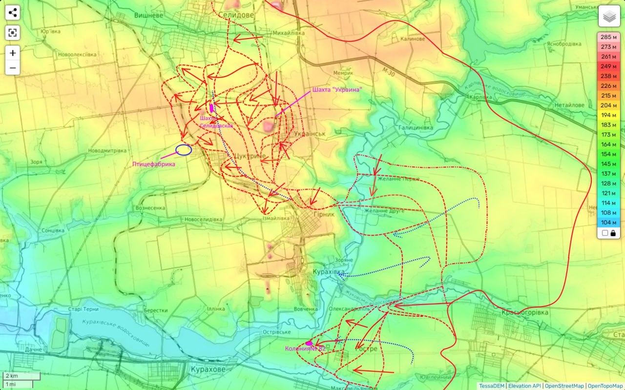 Наши части в н.п. пробуют пробиться за линию железной дороги, а севрнее смогли по ее полотну пройти немного по напраалению к н.п. Вишневое (цели южного охвата Селидово).