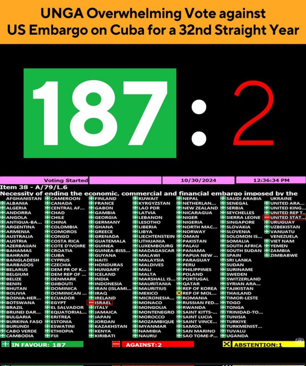 187:2 — таков результат голосования на Генеральной Ассамблее ООН 30 октября за прекращение блокады США в отношении Кубы. Антиамериканскую резолюцию A/79/L.6 поддержали 187 государств. Против — только сами США и Израиль в довесок. Молдавия курьёзно воздержалась: "не определилась с выбором".