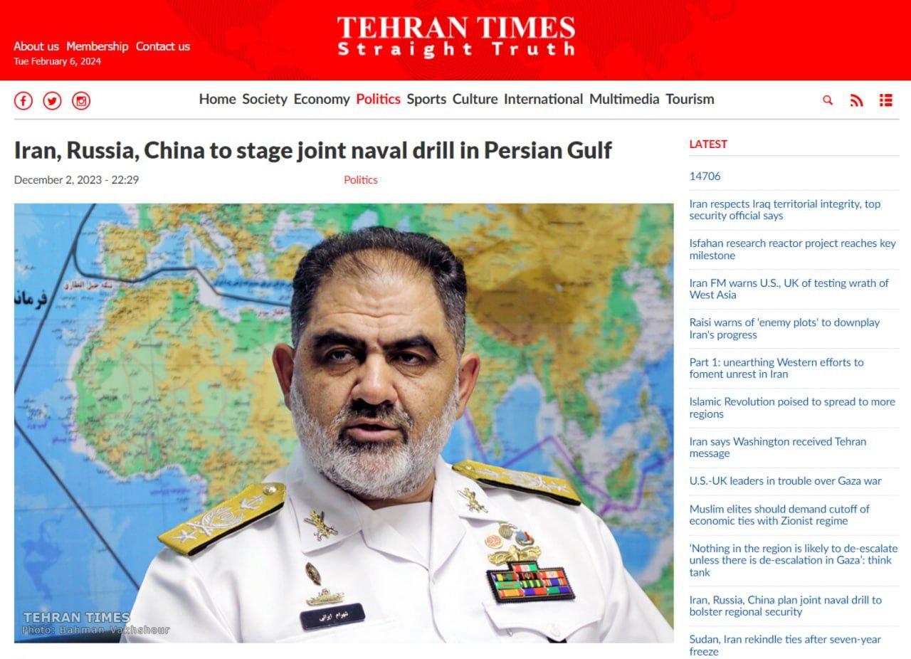 Вчера в центральных российских СМИ прошла новость о том, что главнокомандующий ВМС Ирана контр-адмирал Шахрам Ирани анонсировал проведение военно-морских учений Ирана, Китая и России.