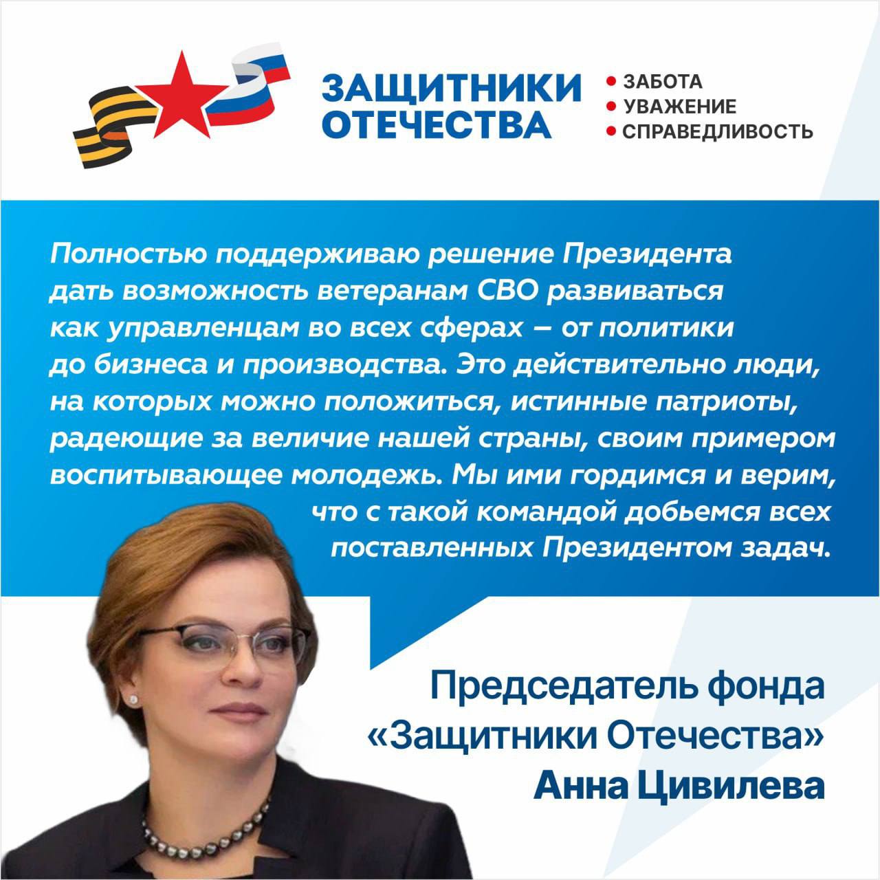 Полностью поддерживаю решение Президента дать возможность ветеранам СВО развиваться как управленцам во всех сферах – от политики до бизнеса и производства. Это люди, на которых действительно можно положиться, истинные патриоты, радеющие за величие страны, своим примером воспитывающие молодежь. Мы ими гордимся и верим, что с такой командой добьемся всех поставленных главой государства задач.
