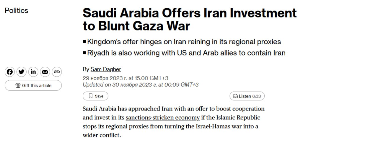❗️Как пишет Bloomberg, Саудовская Аравия предложила Ирану расширить сотрудничество и провести инвестиции в экономику страны. В обмен на это Иран должен удержать подконтрольные радикальные группировки, чтобы те не допустили расширения кризиса в Газе в полномасштабную ближневосточную войну.