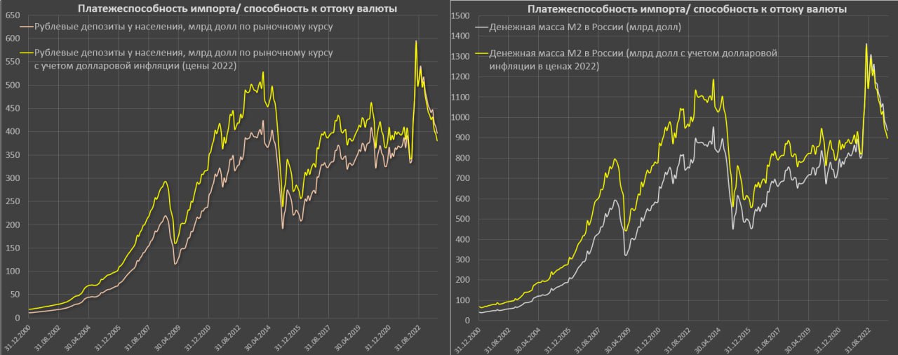 Рублевые сбережения в валютной оценке позволяют оценить покупательную способность импорта и потенциальный масштаб оттока капитала. Очевидно, чем ниже рубль – тем меньше возможностей.