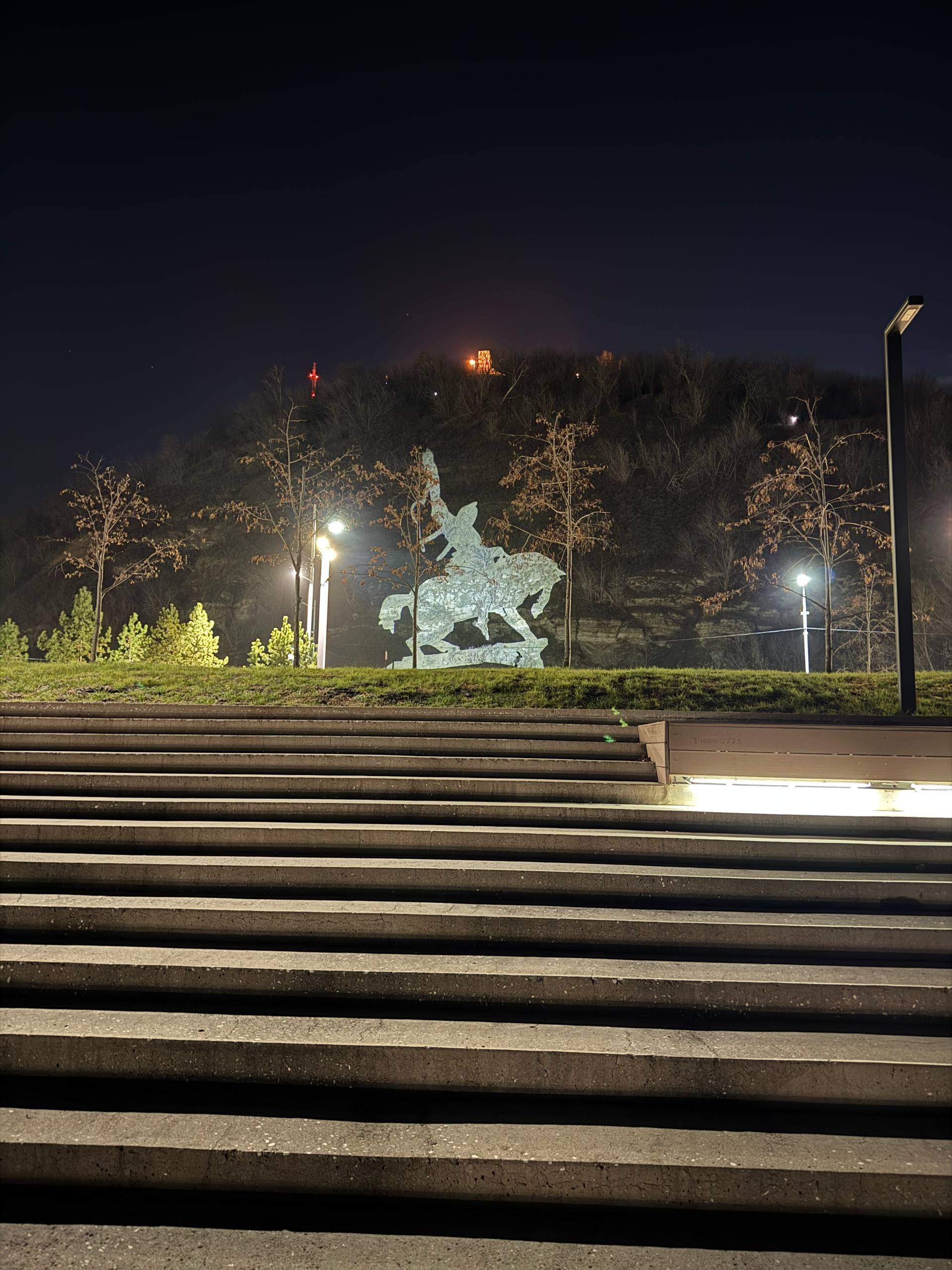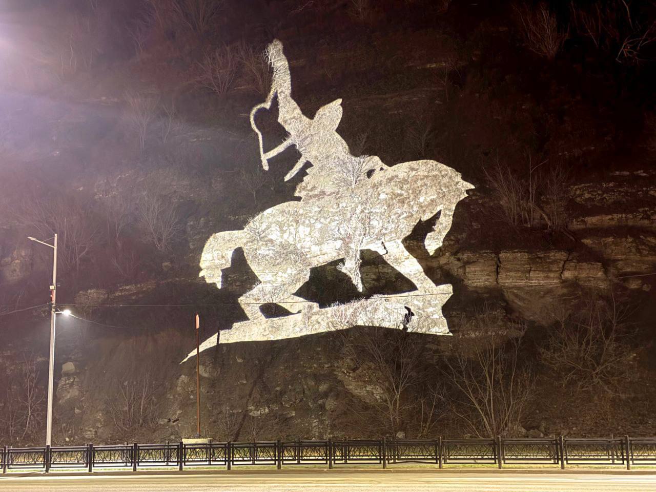 На склоне горы зажглась его проекция. Она хорошо видна с набережной реки Белой.