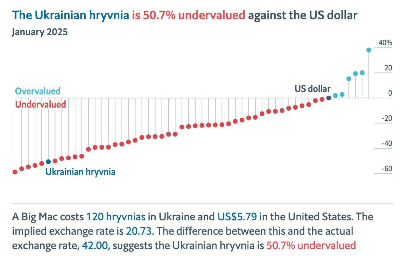 Биг-Мак стоит в Украине 120 гривен, в то время как в США – $5,79. Таким образом, курс украинской валюты недооценен на 50,7% по сравнению с фактическим обменным курсом 42,0 грн/доллар, а курс покупательной способности должен быть на уровне 20,73 грн/доллар.