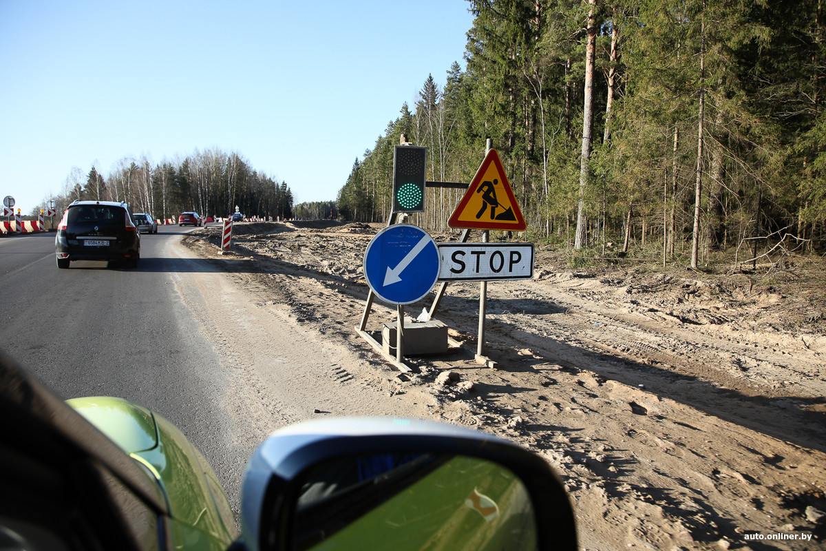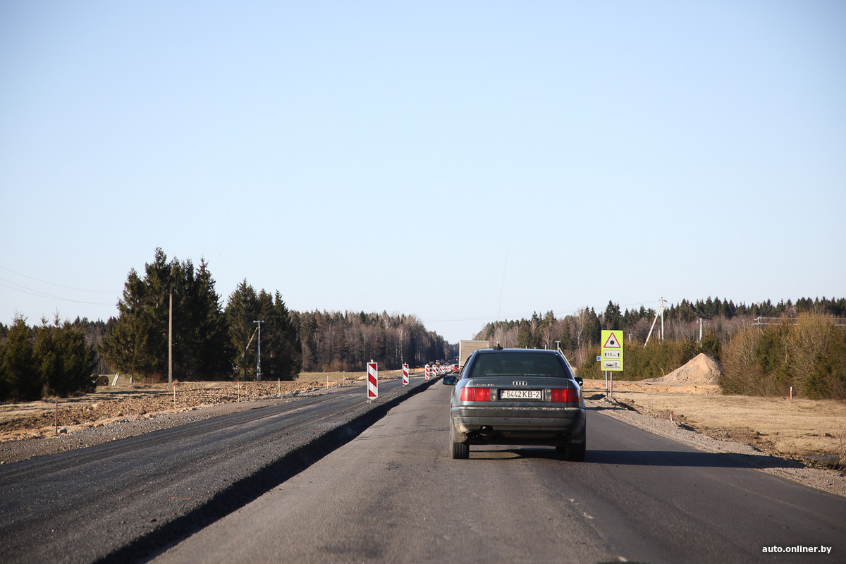 Эх, надо было, как и планировали изначально, ехать по живописной «старой полоцкой» дороге через Ушачи — за Лепелем на трассе Р46 ремонт за ремонтом. Ограничения скорости, периодически езда в колонне, кое-где даже светофорное регулирование на отдельных участках. Зато там, где дорога уже отремонтирована, ехать приятно. После того, как все работы закончат, путь до Полоцка станет приятнее и быстрее.