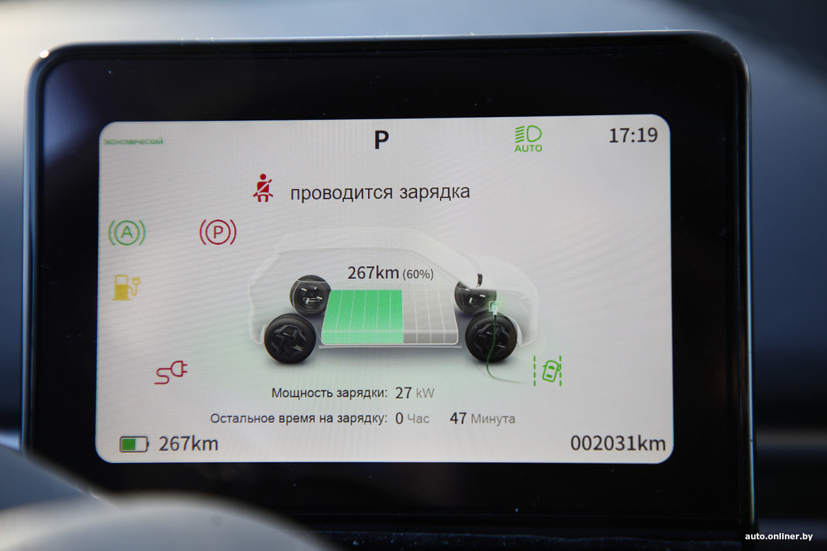 По итогу зарядка заняла около часа. Но ее решили остановить заранее, на 95%: мощность стала падать, и последние киловатты пришлось бы «памповать» очень долго. Бортовой компьютер оптимистично обещает запас хода в 416 км, мы, разумеется, этому не верим, но, по нашим расчетам, нам должно было хватить, чтобы доехать до Минска без жестких мер экономии. В крайнем случае заедем на зарядку в Логойске или Острошицком городке.