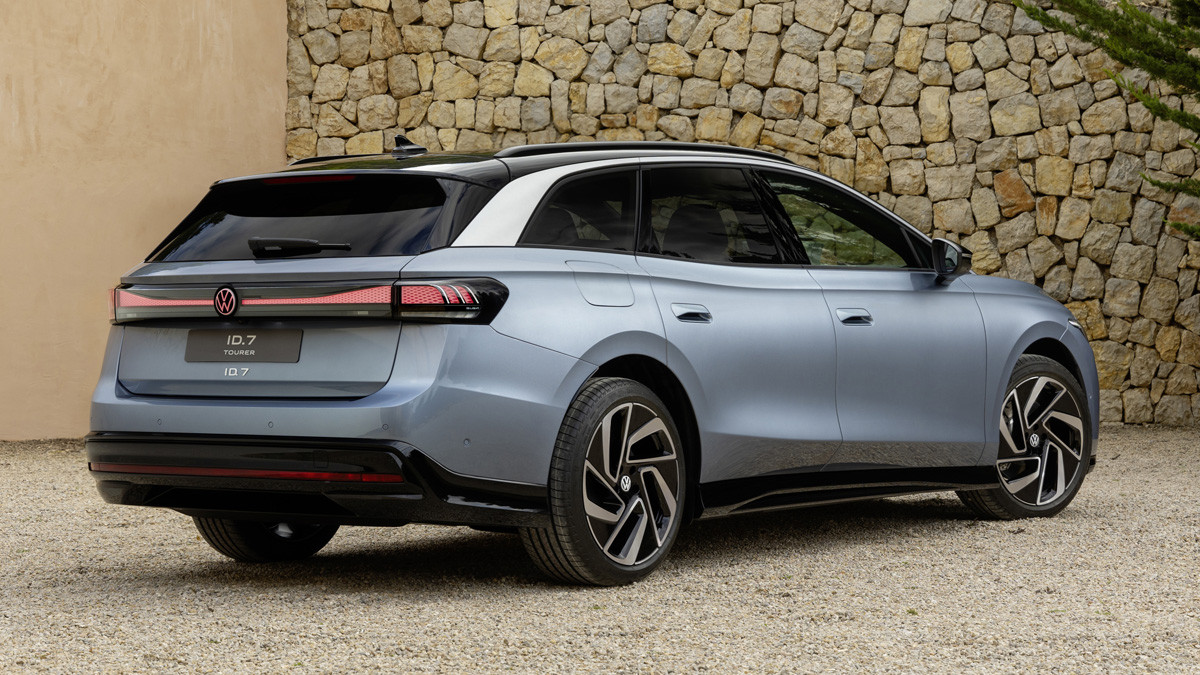 Визуально передняя часть Volkswagen ID.7 Tourer такая же, как у лифтбека. Корма отличается за счёт формы крыши и менее покатой багажной двери, при этом фонари и задний бампер оформлены так же, как у «просто» ID.7. Уже в базе модель оснастили 19-дюймовыми колёсными дисками. Коэффициент аэродинамического сопротивления Cx у ID.7 Tourer равен 0,24 (у «зелёного» лифтбека – 0,23); для сравнения, этот же показатель у актуального Passat Variant составляет 0,25.