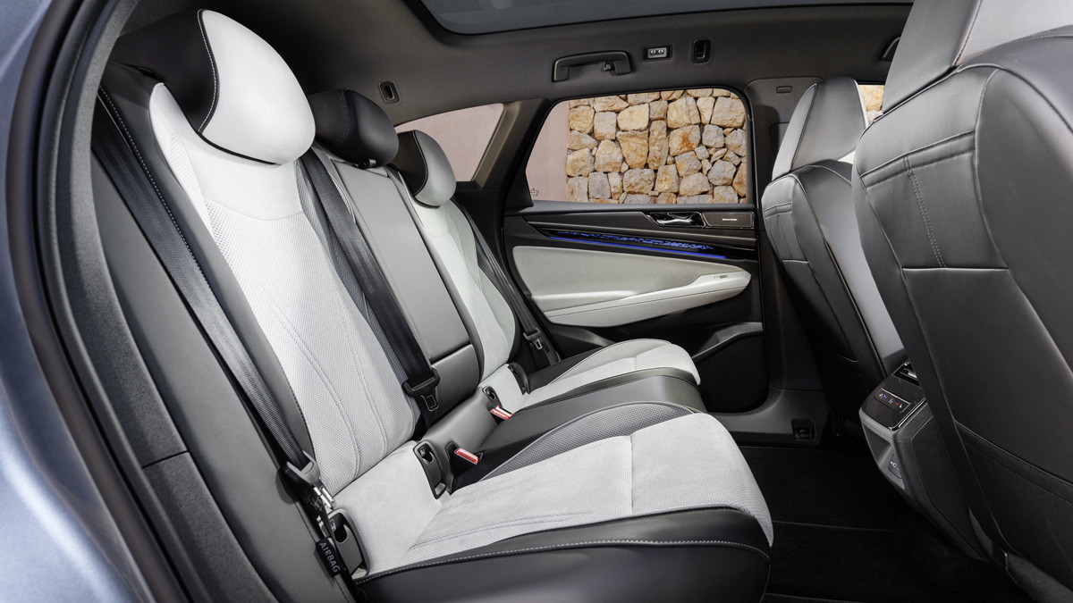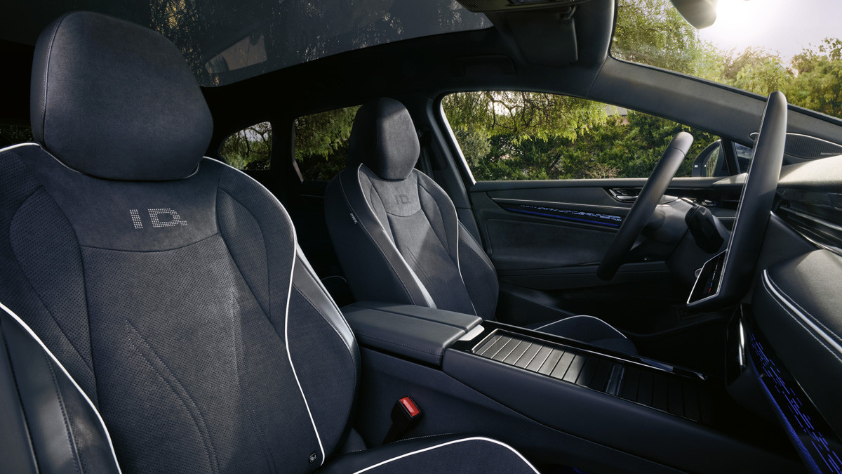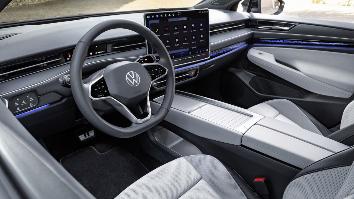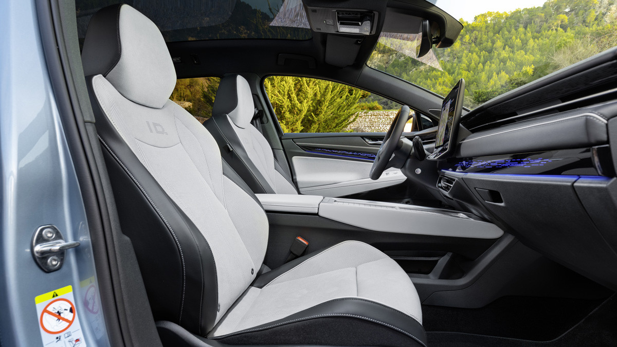 Салон универсала такой же, как у лифтбека, это значит, что роль щитка приборов выполняет проекционный дисплей с дополненной реальностью, по центру передней панели расположен 15-дюймовый тачскрин информационно-развлекательной системы с голосовым ассистентом Volkswagen IDA, а мультируль снабдили сенсорными кнопками. За доплату предлагается панорамная крыша с «умным стеклом», которое можно сделать непрозрачным без шторки.