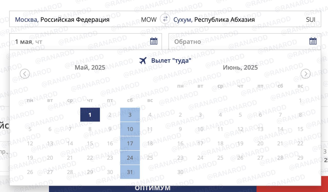 🇷🇺⚡️ «ЮВТ АЭРО», вероятно, начнёт полёты из Москвы в Сухум ещё раньше — в системе бронирования появился рейс на 1 мая. На старте продаж самой ранней датой было 3 мая.