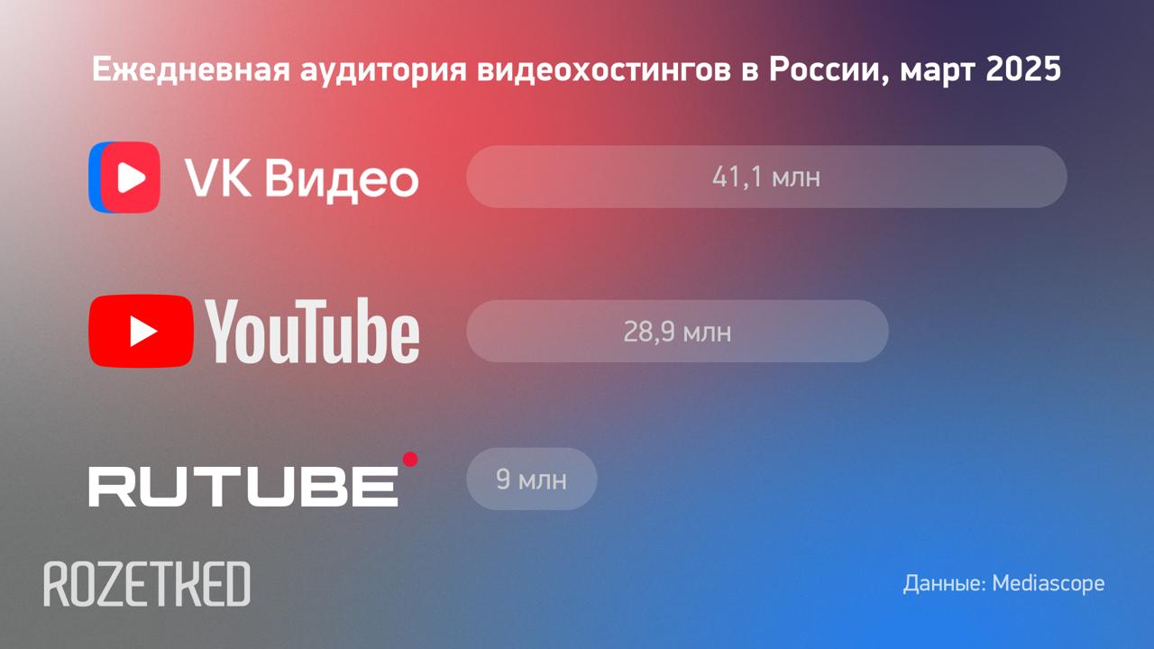 Отрыв увеличиваетсяВ марте 41,1 млн россиян посещали «VK Видео» каждый день, YouTube — 28,9 млн, Rutube — 9 млн человек, следует из отчёта аналитиков Mediascope.