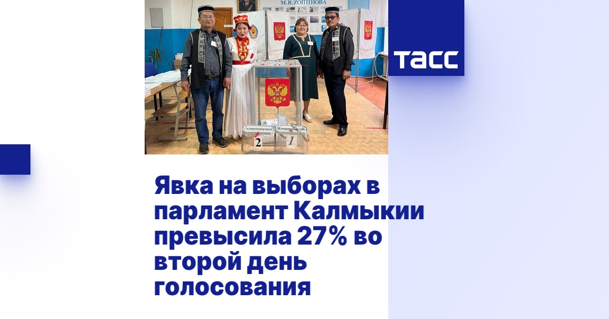 Голосование на выборах в парламент в республике началось 8 сентября и продлится до 20:00 мск 10 сентября. По итогам первого дня в республике проголосовали около 15% избирателей. На территории региона работают 227 участков, организацию процедуры голосования обеспечивают около 2 тыс. членов участковых избирательных комиссий. Направления на избирательные участки получили более 1,2 тыс. наблюдателей от избирательных объединений, зарегистрированных кандидатов и Общественной палаты Республики Калмыкия.