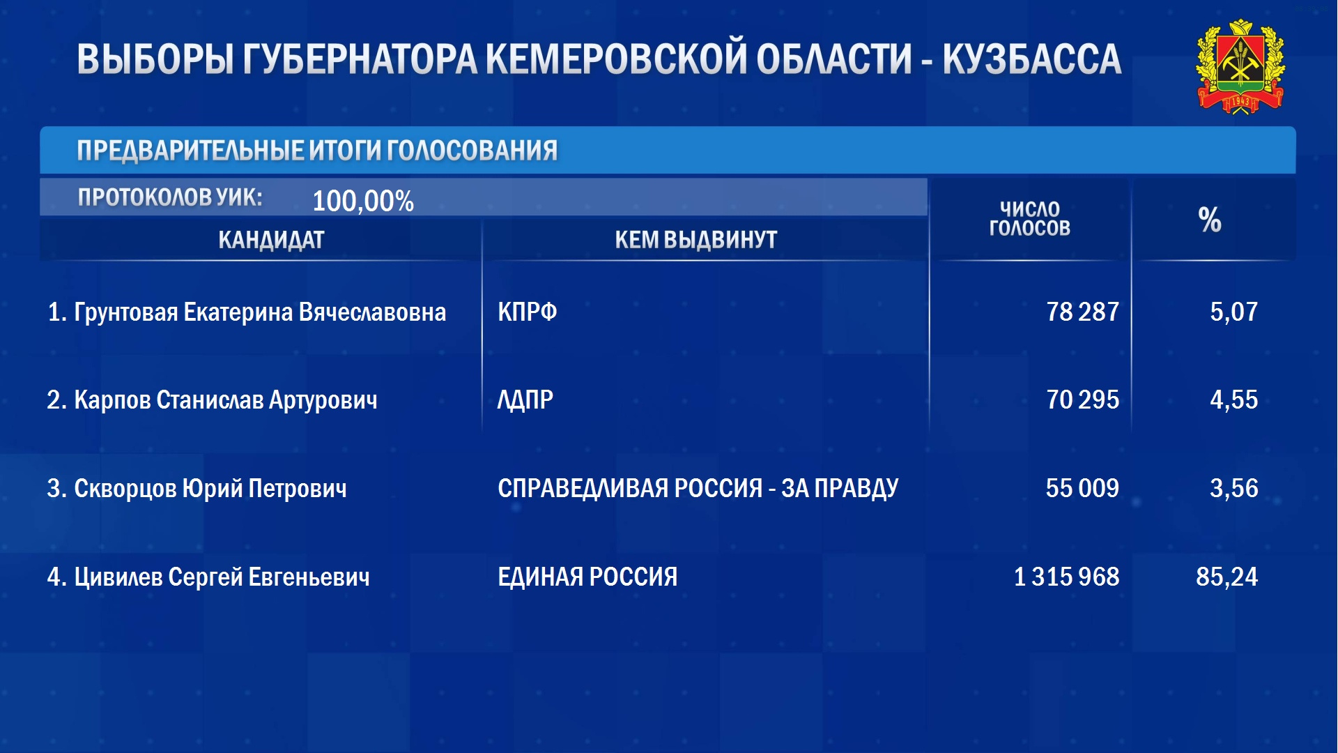 Действующий губернатор Кемеровской области Сергей Цивилев по итогам обработки всех протоколов участковых избирательных комиссий победил на состоявшихся выборах. Согласно данным ЦИК, опубликованным в понедельник, 11 сентября, за него проголосовали более 1 млн избирателей.