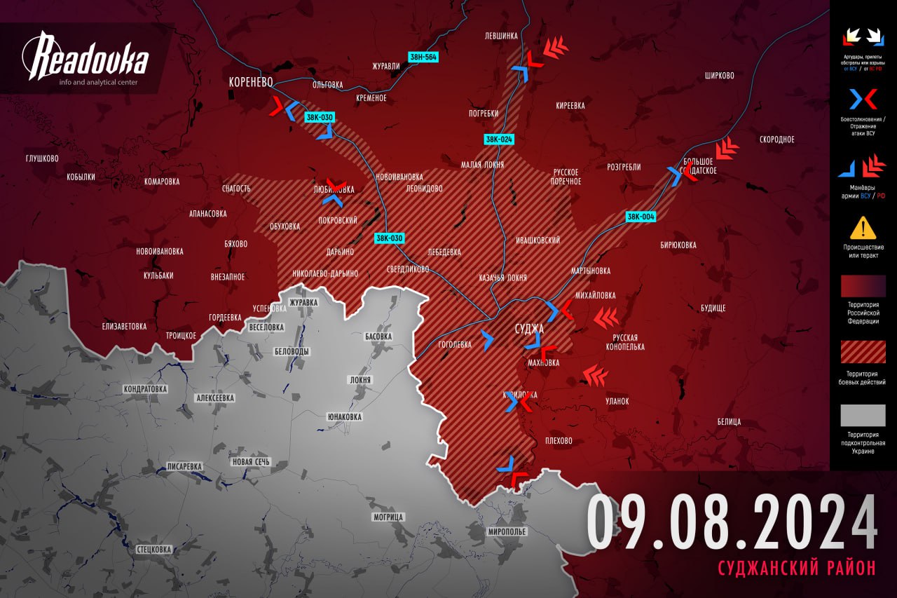 К вечеру, когда стало подтверждаться прибытие наших подкреплений в виде подразделений спецназа, ситуация, по осторожным предварительным сообщениям, стала выравниваться. Возобновились столкновения с врагом в районе Суджи, в том числе в городской черте, возле Коренево — на данный момент оба райцентра удерживаются нашими. Утверждается, что ночью была попытка налета ВСУ на Большое Солдатское — ее отбили.