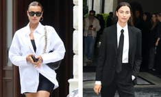 Любимое сочетание от Ирины Шейк — белая рубашка и прямые брюки. Звезда носит их и с однотонными моделями, и с принтованными — например, полосатыми. Шейк застегивает рубашку не до конца, а до середины живота, делая наряд более свободным.
