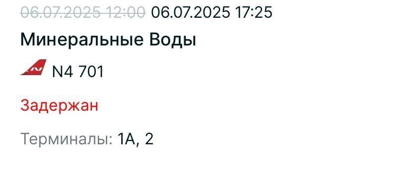 Судя по данным, отложить два своих рейса пришлось авиакомпании NordWind. Перевозчик не может отправить самолеты в Минеральные Воды и в Калининград. Первый рейс отправится с задержкой в 5 часов, а второй на 30 минут.