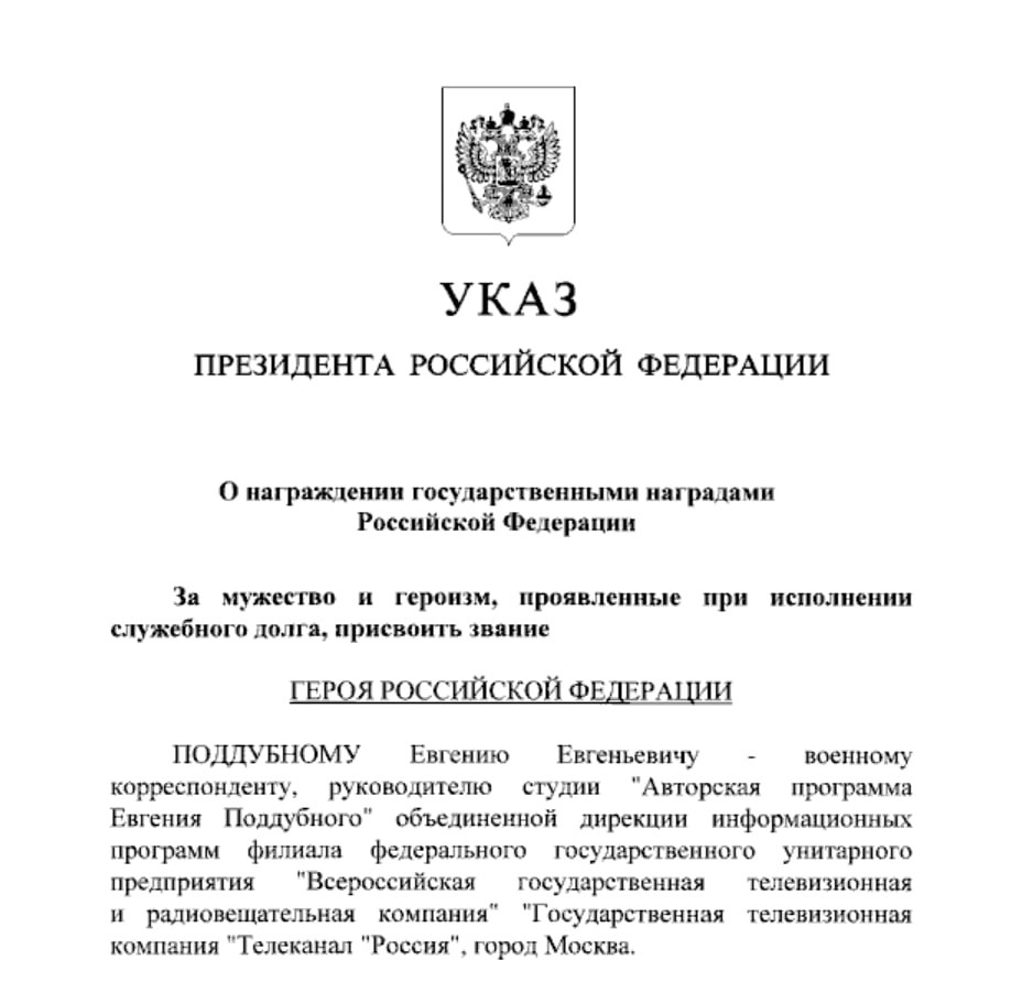 Верховный присвоил звание Героя России военкору Евгению Поддубному