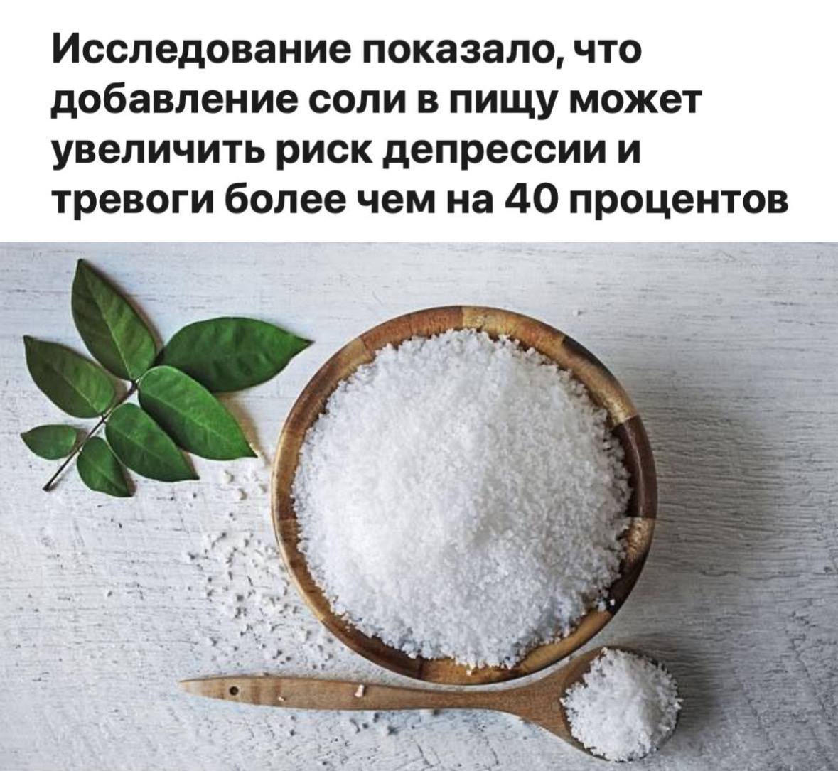 Избыток соли в рационе может быть связан с повышенным риском депрессии и тревожности. Исследование, охватившее почти полмиллиона человек, показало, что любители соленого на 40% чаще испытывают апатию. Даже небольшое увеличение потребления соли повышает риск развития тревожности на 5–8%.